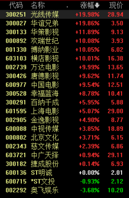 (影視院線板塊多股漲停/截圖來自同花順)