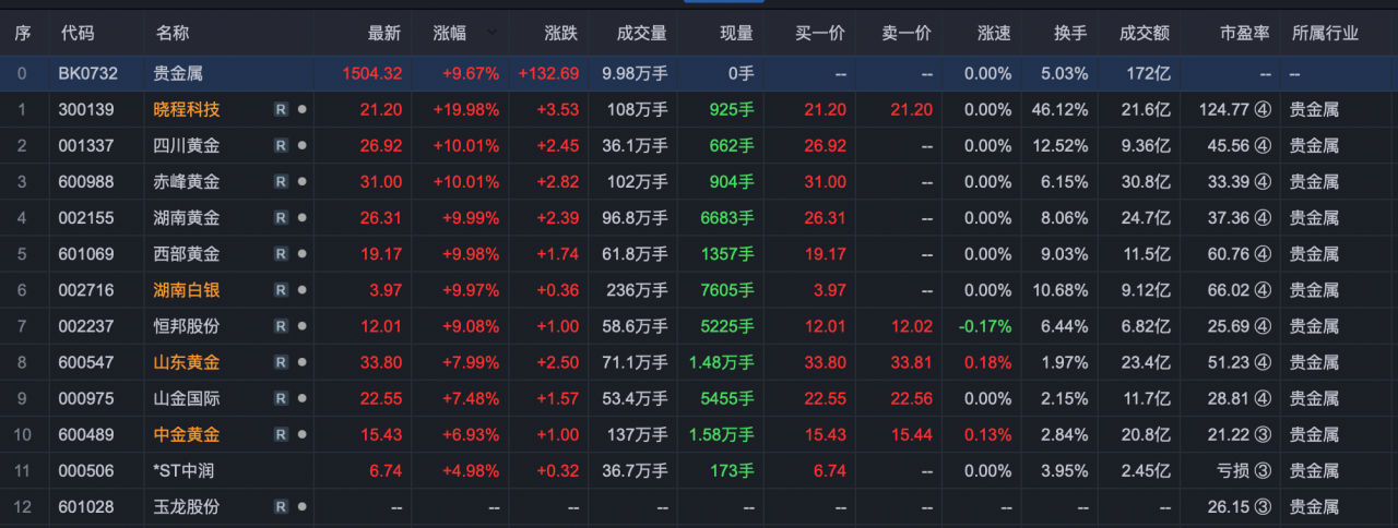截至4月21日收盤,貴金屬板塊以9.67%的漲幅領(lǐng)漲全市。板塊中,除中金黃金(600489)、山金國(guó)際(000975)、山東黃金(600547)漲幅不到10%及玉龍股份(601028)停牌外,其余個(gè)股全都漲停。