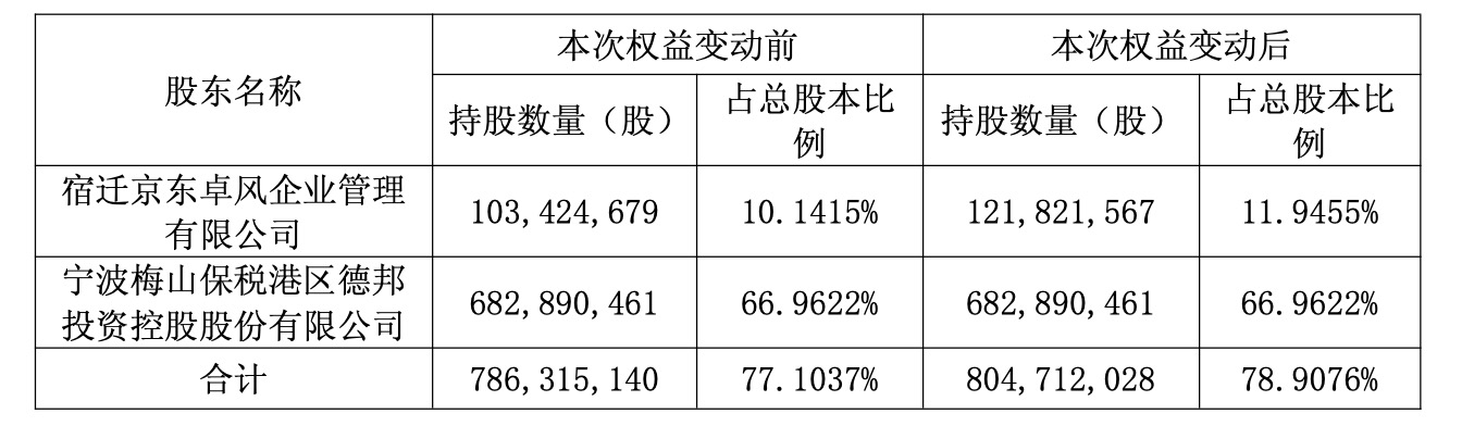 德邦股份公告顯示,4月28日至5月7日期間,宿遷京東卓風(fēng)企業(yè)管理有限公司(以下簡稱“京東卓風(fēng)”)通過集中競價(jià)交易方式、大宗交易方式增持公司股份共18396888股,占公司目前總股本的比例為1.8039%。本次權(quán)益變動(dòng)后,京東卓風(fēng)直接持有公司股份121821567股,約占公司總股本的11.9455%,德邦控股及京東卓風(fēng)合計(jì)持有公司股份804712028股,約占公司總股本的78.9076%。