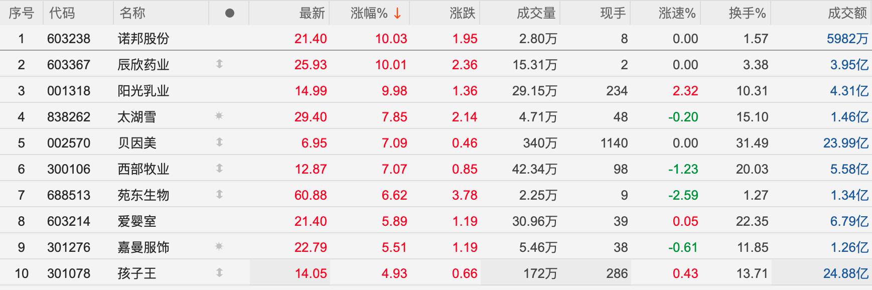 7月29日,受國(guó)家育兒補(bǔ)貼制度實(shí)施方案公布的利好刺激,A股乳業(yè)、嬰童、生殖等相關(guān)主題板塊開盤強(qiáng)勢(shì)拉升。截至記者發(fā)稿,乳業(yè)板塊陽(yáng)光乳業(yè)(001318.SZ)漲停,騎士乳業(yè)(832786.BJ)漲11.28%,貝因美(002570.SZ)、西部牧業(yè)(300106.SZ)漲超5%;嬰童板塊諾邦股份(603238.SH)、辰欣藥業(yè)(603367.SH)漲停,太湖雪(838262.BJ)、苑東生物(688513.SH)、愛(ài)嬰室(603214.SH)、嘉曼服飾(301276.SZ)漲超5%;生殖板塊眾生藥業(yè)(002317.SZ)漲停。