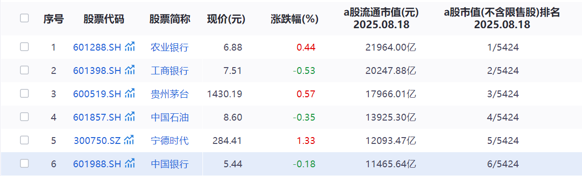 同花順iFind數(shù)據(jù)統(tǒng)計(jì)顯示,截至上午收盤時(shí)間,A股市值總和為114萬(wàn)億元,突破100萬(wàn)億元,創(chuàng)歷史新高,這也是A股市值歷史上首次突破100萬(wàn)億元大關(guān)。具體來(lái)看,截至上午收盤時(shí)間,農(nóng)業(yè)銀行位居A股市值榜首位,約為2.20萬(wàn)億元,工商銀行A股市值2.02萬(wàn)億元位居次席。此外,貴州茅臺(tái)、中國(guó)石油、寧德時(shí)代、中國(guó)銀行等4股A股市值均超萬(wàn)億元。