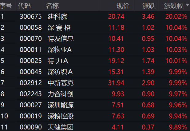 截至午間收盤,多只深圳本地股漲停,建科院以20.02%漲幅領漲,深賽格、特發(fā)信息、深物業(yè)A、特力A、深紡織A、中新賽克、力合科創(chuàng)、深圳能源、深糧控股、天健集團等股均“10cm”漲停。另外,麥捷科技、深圳燃氣等股均漲超4%。