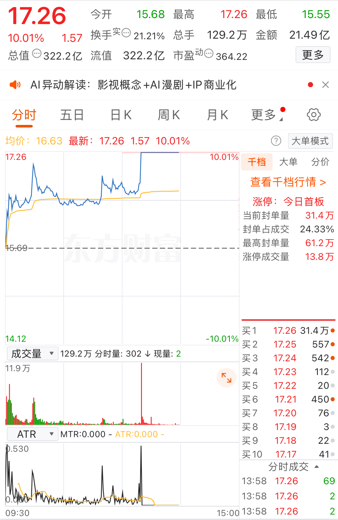 11月5日午后,A股市場(chǎng)影視院線板塊短線拉升,13時(shí)20分中國(guó)電影直奔漲停,截至記者發(fā)稿時(shí),中國(guó)電影買一封單超30萬(wàn)手。