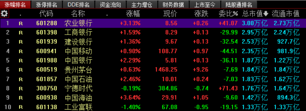 保險、銀行等大金融板塊逆勢走強。農(nóng)業(yè)銀行開盤后持續(xù)拉升,以超過3%的漲幅領(lǐng)漲銀行股,盤中股價再創(chuàng)歷史新高,截至午間收盤,報8.56元/股,總市值達(dá)到3萬億元,年內(nèi)累計漲幅超過67%。中國銀行、渝農(nóng)商行、工商銀行等跟漲,漲幅分別為2.29%、1.86%、1.59%。