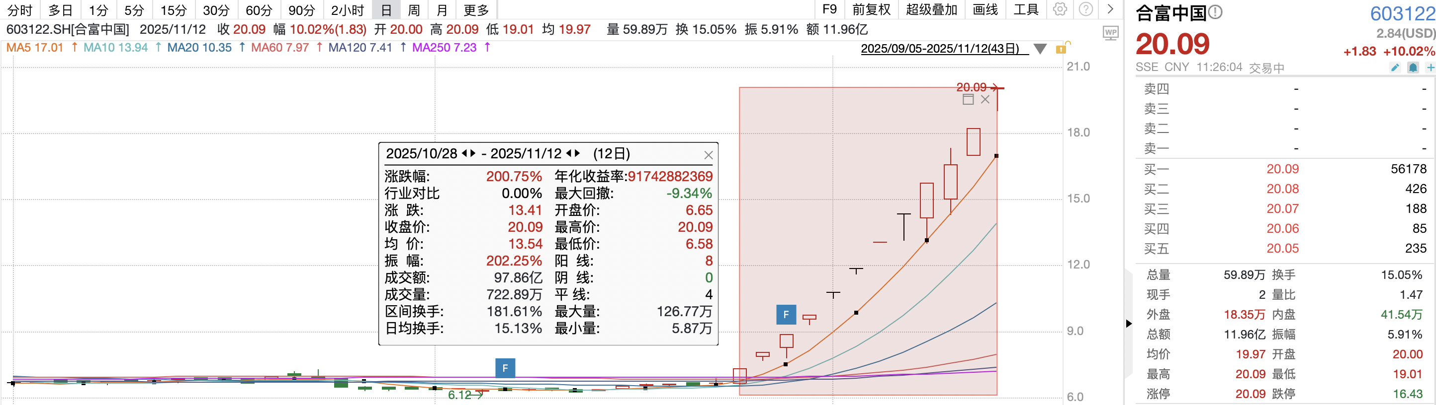11月12日,合富中國股票開盤漲停,中間雖一度打開漲停板,但隨后再度漲停。截至午間收盤,Wind數(shù)據(jù)顯示,合富中國股票從10月28日的6.65元/股一路飆升至11月12日的20.09元/股,累計(jì)漲幅高達(dá)200.75%,總市值也從不足30億元膨脹至80億元。