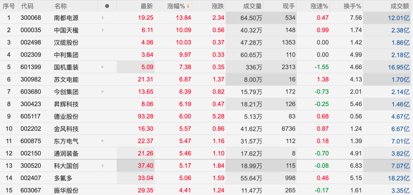 截至記者發(fā)稿,中國天楹(000035.SZ)、漢纜股份(002498.SZ)、中利集團(002309.SZ)等多只儲能概念股強勢漲停,南都電源(300068.SZ)漲幅高達13.84%。此外,國機重裝(601399.SH)、蘇文電能(300982.SZ)、今創(chuàng)集團(603680.SH)等個股也有不俗表現(xiàn),漲幅均超過6%。