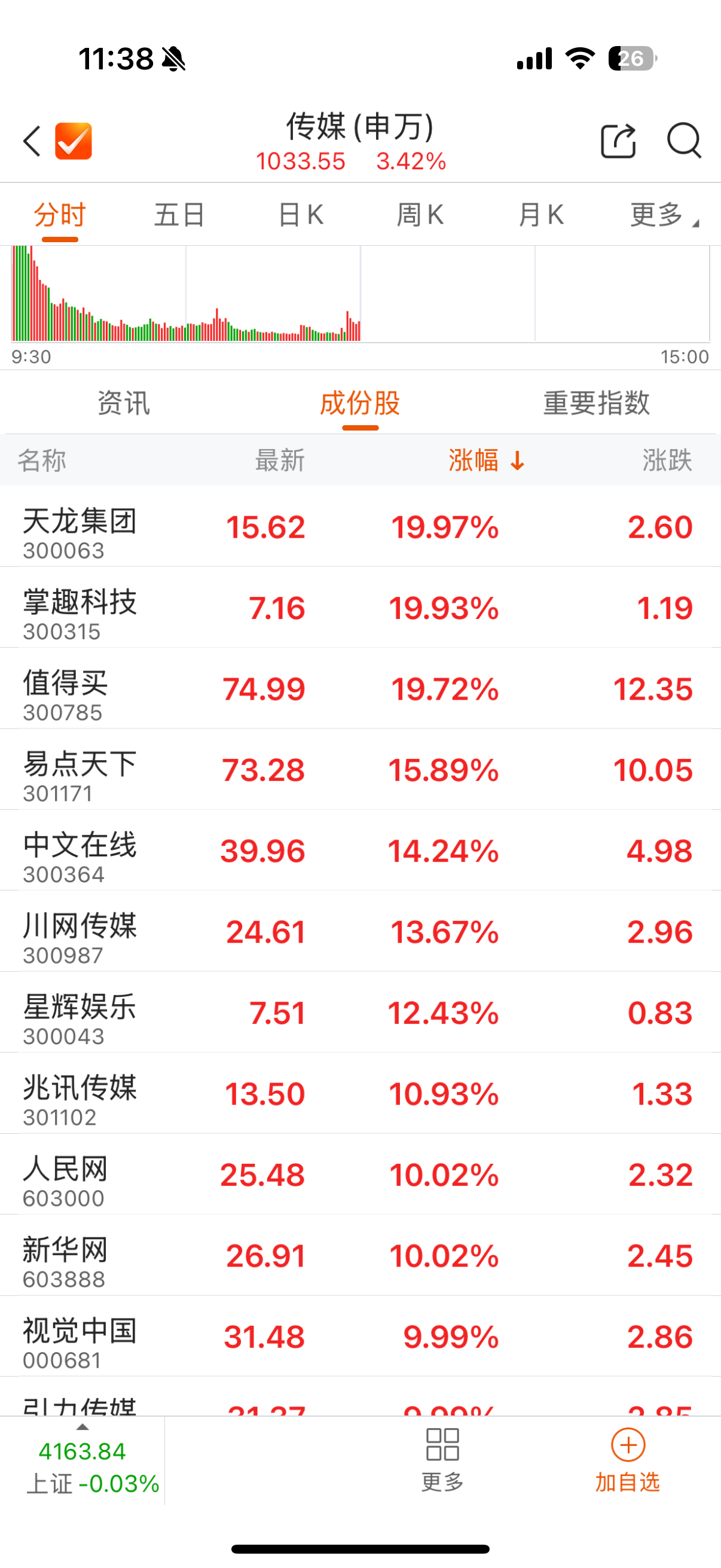 1月13日,傳媒(申萬)板塊延續(xù)強(qiáng)勢走勢,截至中午收盤,板塊指數(shù)報(bào)1033.55點(diǎn),單日漲幅達(dá)3.42%,個股普漲態(tài)勢顯著。天龍集團(tuán)(300063)、人民網(wǎng)(603000)、新華網(wǎng)(603888)、引力傳媒(603598)等均漲停。其中,引力傳媒7個交易日內(nèi)錄得6個漲停。