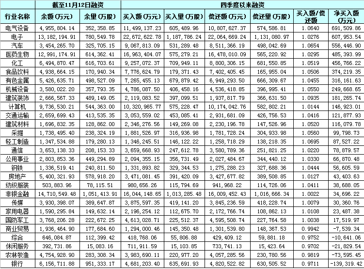 數(shù)據(jù)顯示,四季度以來截至11月12日,共有23個(gè)行業(yè)呈現(xiàn)期間融資凈買入,電氣設(shè)備、電子和汽車等三行業(yè)成為融資客布局重點(diǎn),期間融資凈買入額均在50億元以上,分別為69.15億元、60.80億元、55.64億元,合計(jì)融資凈買入額達(dá)到185.59億元。