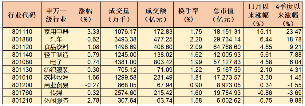 表:大消費(fèi)概念相關(guān)行業(yè)11月19日及4季度以來(lái)市場(chǎng)表現(xiàn)一覽