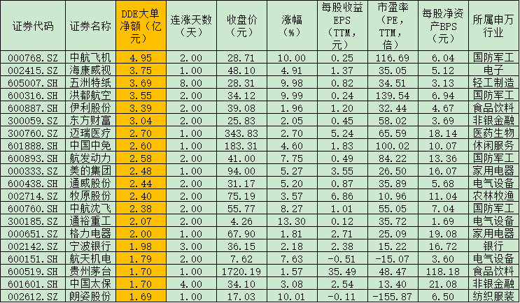 從資金層面看,今日A股大單資金整體凈流出143.75億元,占成交額1.86%,有1516只個(gè)股凈流入,2504只個(gè)股凈流出。有7類申萬一級(jí)行業(yè)呈現(xiàn)大單資金凈流入,國(guó)防軍工、家用電器、食品飲料等位居前三。