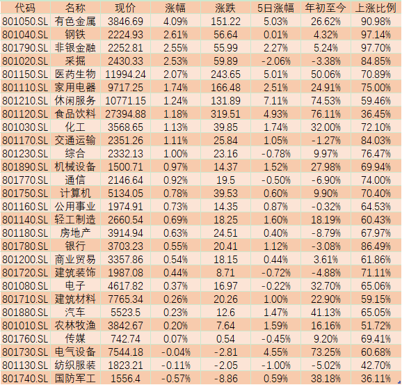 行業(yè)指數(shù)方面,有25類申萬一級行業(yè)指數(shù)上漲,占比89.29%,其中,有色金屬(4.09%)、鋼鐵(2.61%)、非銀金融(2.55%)等行業(yè)居前三。