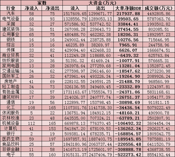 從資金層面看,今日A股大單資金整體凈流出163.19億元,其中,有1387只個(gè)股凈流入,2636只個(gè)股凈流出。從申萬(wàn)一級(jí)的28個(gè)行業(yè)來(lái)看,有9個(gè)行業(yè)呈現(xiàn)大單資金凈流入態(tài)勢(shì),其中,汽車行業(yè)資金凈流入居首,達(dá)21.79億元,緊隨其后的是電氣設(shè)備、采掘、建筑裝飾等三行業(yè),資金凈流入均超2億元。另外,電子、非銀金融、食品飲料等行業(yè)資金凈流出均超20億元。