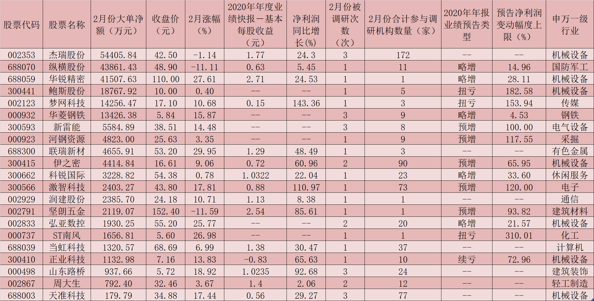 年報(bào)業(yè)績(jī)預(yù)期向好或是近期機(jī)構(gòu)頻繁調(diào)研的重要支撐。在上述2月份被機(jī)構(gòu)調(diào)研的146家公司中,截至2月28日,愛(ài)美客已披露2020年年報(bào)業(yè)績(jī),報(bào)告期內(nèi)實(shí)現(xiàn)凈利潤(rùn)同比增長(zhǎng)43.93%。同時(shí),還有49家公司也披露2020年年度業(yè)績(jī)快報(bào),報(bào)告期內(nèi)實(shí)現(xiàn)凈利潤(rùn)同比增長(zhǎng)的公司有40家,其中,夢(mèng)網(wǎng)科技、金科文化、樂(lè)心醫(yī)療、激智科技、海爾生物等5家公司2020年全年凈利潤(rùn)實(shí)現(xiàn)同比翻番。