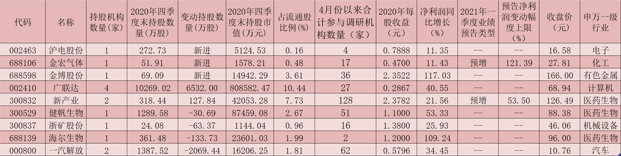 良好的業(yè)績表現(xiàn)或是近期機(jī)構(gòu)頻繁調(diào)研的重要支撐。在上述4月份以來被機(jī)構(gòu)調(diào)研的54家公司中,截至4月11日,已有50家公司披露了2020年年報業(yè)績,40家公司報告期內(nèi)實現(xiàn)凈利潤同比增長,占比八成。雙星新材、漢威科技、漢王科技、金博股份、海爾生物等5家公司報告期內(nèi)均實現(xiàn)凈利潤同比翻番。