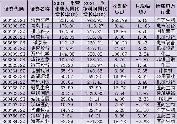 另外,從營(yíng)業(yè)收入增幅來看,在已披露一季度業(yè)績(jī)的19家公司中,18家公司一季度營(yíng)業(yè)收入實(shí)現(xiàn)同比增長(zhǎng),僅有1家公司營(yíng)業(yè)收入同比出現(xiàn)下降。其中,通策醫(yī)療、青島中程、振芯科技、科森科技、璞泰來、集智股份、萬華化學(xué)、華鐵應(yīng)急等8家公司,今年一季度營(yíng)業(yè)收入同比增長(zhǎng)均超過100%。