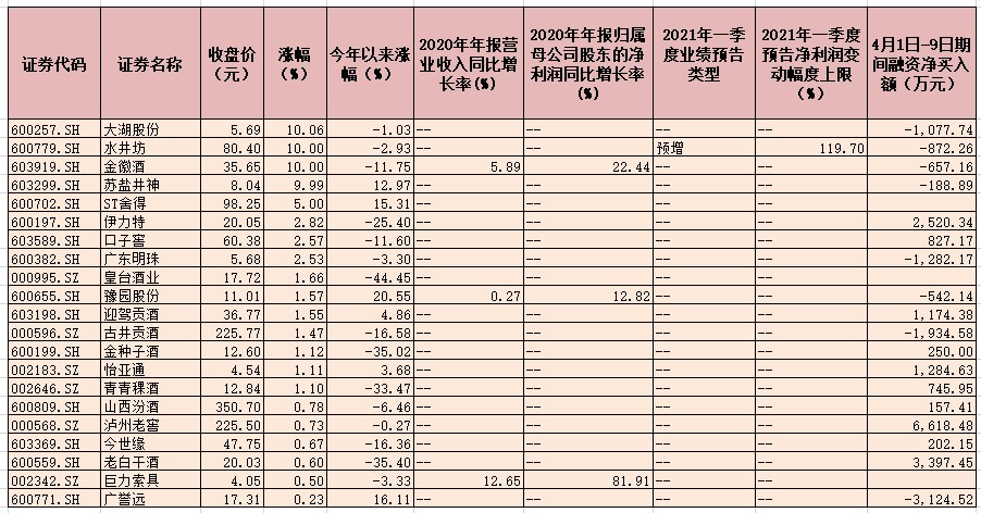 表:4月9日實(shí)現(xiàn)上漲的白酒概念股一覽