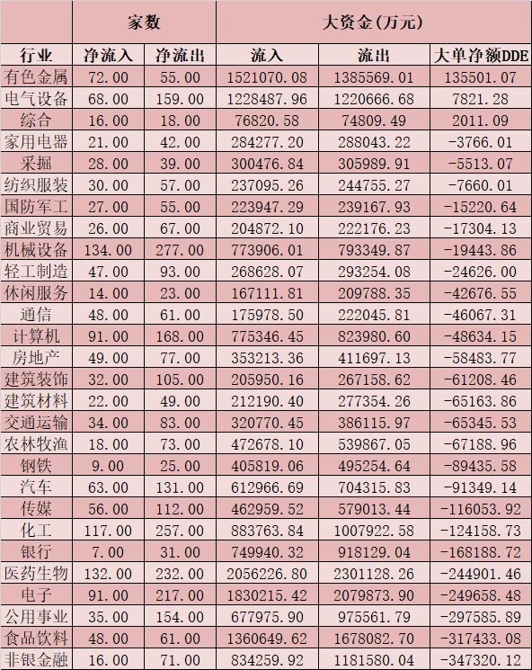 從資金層面看,周四,A股大單資金整體凈流出228.12億元,其中,有1331只個股呈現(xiàn)資金凈流入,2743只個股呈現(xiàn)資金凈流出。在申萬一級的28個行業(yè)中,有3個行業(yè)實現(xiàn)大單資金凈流入,有色金屬行業(yè)大單資金凈流入居首,達到13.55億元,電氣設(shè)備、綜合等行業(yè)大單資金凈流入則分別為7821.28萬元、2011.09萬元,另外,食品飲料、非銀金融等兩大行業(yè)大單資金凈流出均超30億元。