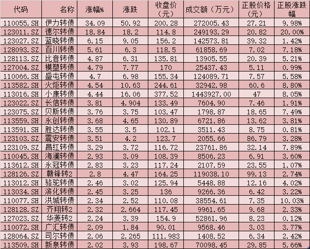 《證券日報》記者根據(jù)同花順數(shù)據(jù)統(tǒng)計發(fā)現(xiàn),4月28日,在358只可轉(zhuǎn)債中,有26只漲幅超2%,伊力轉(zhuǎn)債、德爾轉(zhuǎn)債漲幅均超18%,分別為34.09%、18.84%,藍(lán)曉轉(zhuǎn)債(6.15%)、百川轉(zhuǎn)債(5.61%)、比音轉(zhuǎn)債(4.87%)、模塑轉(zhuǎn)債(4.79%)、盛屯轉(zhuǎn)債(4.7%)、火炬轉(zhuǎn)債(4.54%)和小康轉(zhuǎn)債(4.44%)等漲幅也均逾4%,盡顯強勢。
