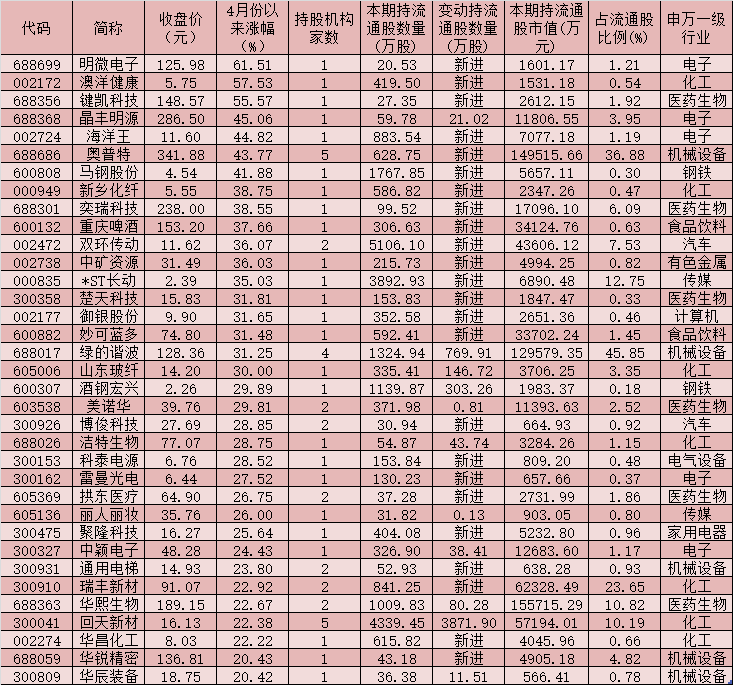表:一季度獲QFII新進(jìn)增持且4月份以來漲幅超20%的個(gè)股一覽