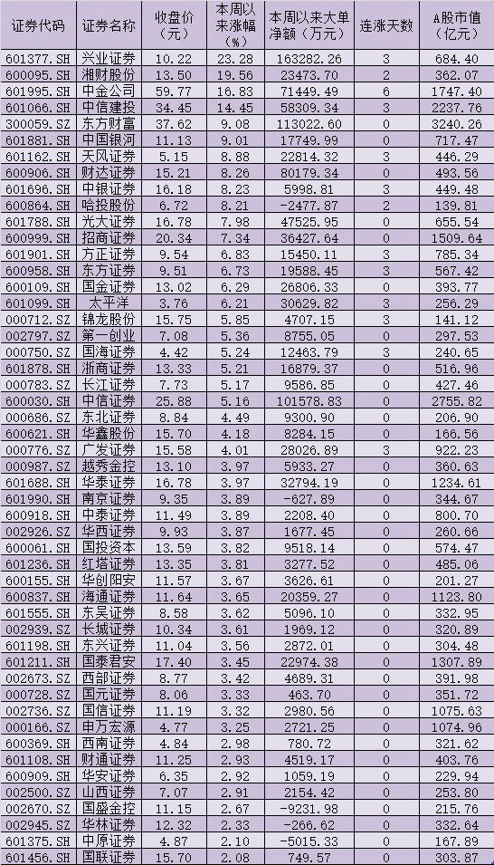 表:本周以來券商股市場表現(xiàn)一覽
