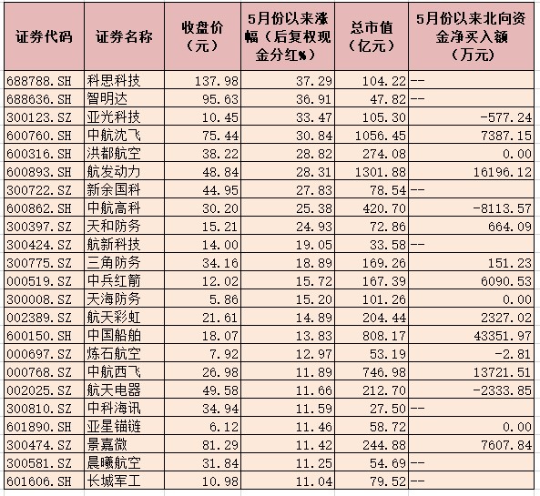 個股方面,5月份以來,截至5月27日收盤,板塊內(nèi)有83只個股期間實現(xiàn)上漲,占比超九成,其中,科思科技、智明達、亞光科技、中航沈飛等4只個股期間累計漲幅居前,分別上漲37.29%、36.91%、33.47%、30.84%,洪都航空、航發(fā)動力、新余國科、中航高科、天和防務(wù)等5只個股期間累計漲幅也均超20%。