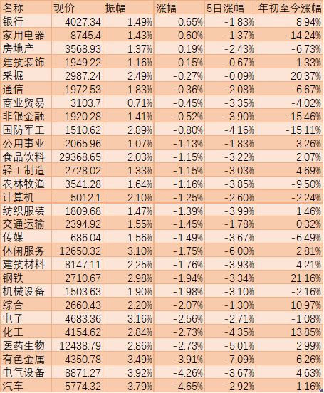 表:周三申萬(wàn)一級(jí)行業(yè)市場(chǎng)表現(xiàn)一覽