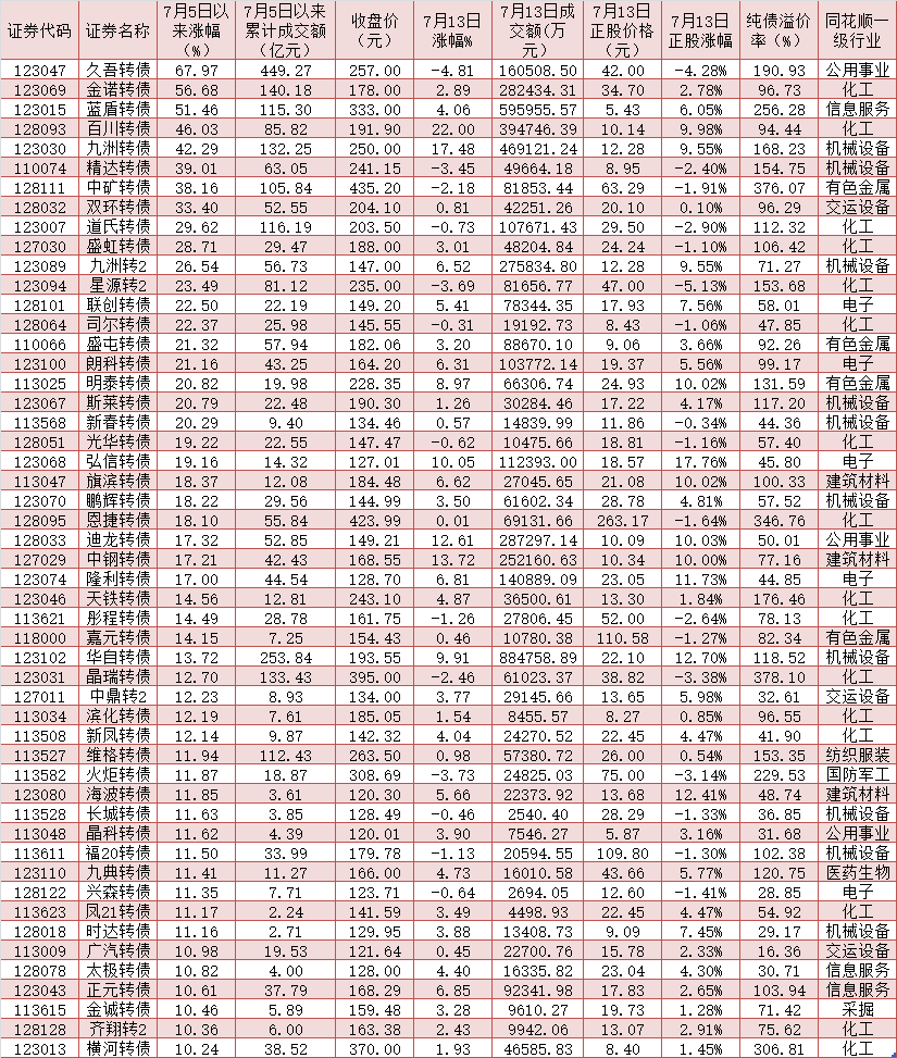表:7月5日以來累計(jì)漲幅超10%的可轉(zhuǎn)債一覽