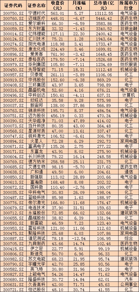 記者統(tǒng)計(jì)發(fā)現(xiàn),7月份以來(lái)截至周二收盤(pán),有55家創(chuàng)業(yè)板上市公司的股價(jià),創(chuàng)出了歷史新高。其中,寧德時(shí)代、邁瑞醫(yī)療、愛(ài)爾眼科、東方財(cái)富、億緯鋰能、匯川技術(shù)、陽(yáng)光電源、康龍化成、愛(ài)美客、泰格醫(yī)藥、華利集團(tuán)、先導(dǎo)智能、貝泰妮等13只創(chuàng)業(yè)板公司的總市值均在千億元以上。