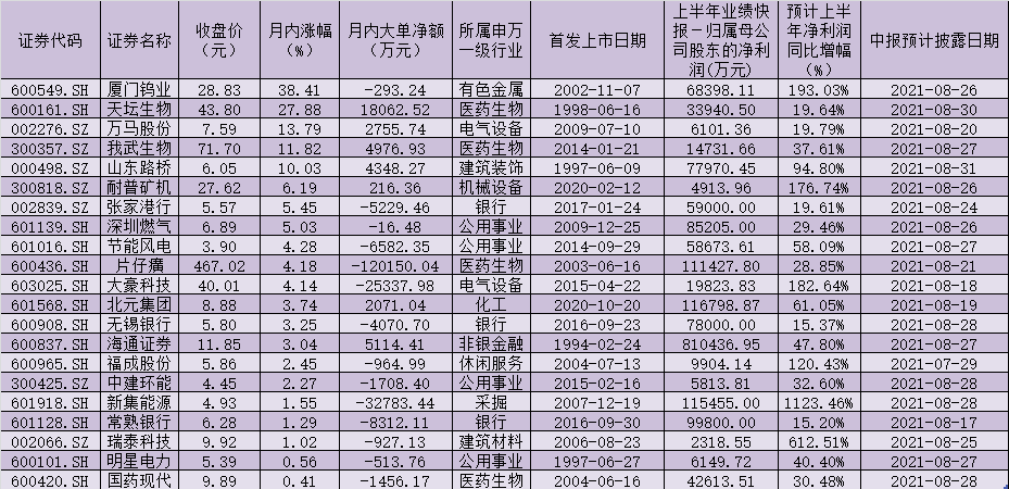 表:21家月內(nèi)股價實現(xiàn)上漲的已披露半年度業(yè)績快報的公司一覽