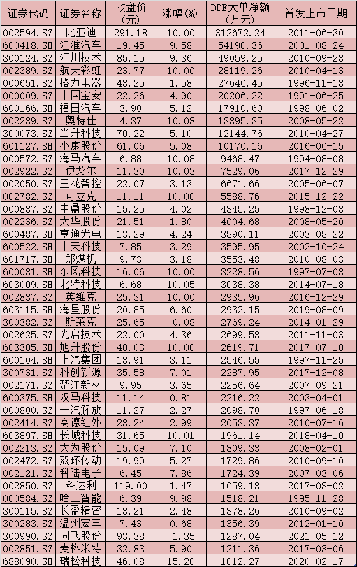 表:8月2日大單資金凈流入在1000萬元以上的新能源車概念股一覽