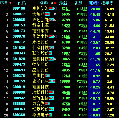 圖為滬深兩市跌幅榜前20只個股