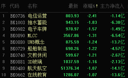此外,電信運(yùn)營(yíng)、抽水蓄能、電子車牌等10類板塊跌幅均超1%。