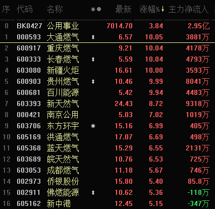 排名第二位的是公用事業(yè),板塊上漲3.84%,大單資金凈流入達(dá)6.44億元,大通燃?xì)?、重慶燃?xì)?、長(zhǎng)春燃?xì)獾?只個(gè)股漲停。