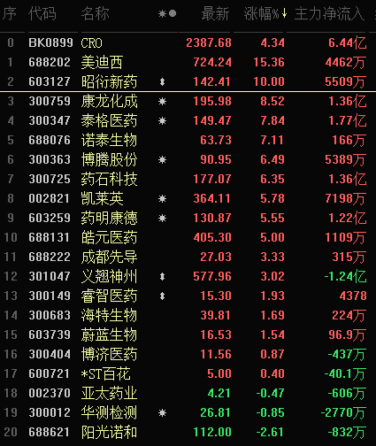 從盤面來(lái)看,CRO概念板塊指數(shù)飆升4.34%,排名第一,板塊大單資金凈流入達(dá)6.44億元,昭衍新藥漲停,板塊漲幅第一的美迪西登上龍虎榜。