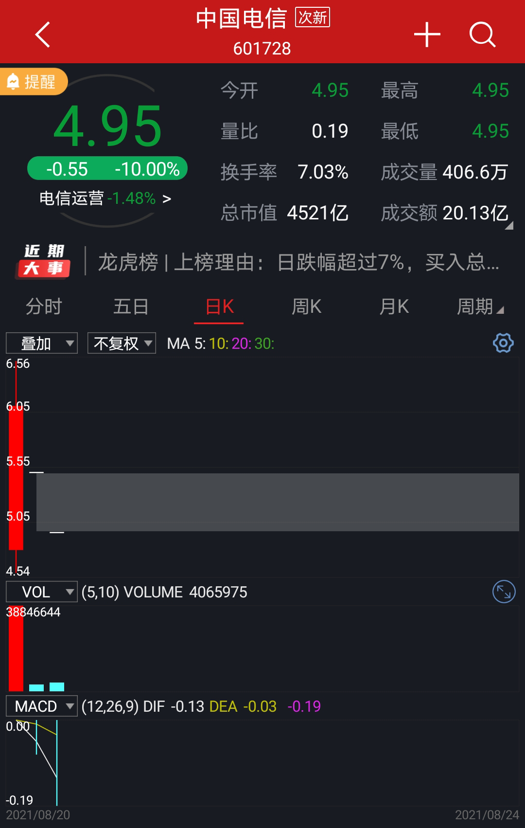 中國(guó)電信在上市第一天大漲35%,在隨后2天則連續(xù)跌停。兩日跌停下,中國(guó)電信市值蒸發(fā)1059.41億元。截至收盤,報(bào)4.95元/股,跌停板上783萬(wàn)手封單封死跌停。目前中國(guó)電信總市值4521億元。