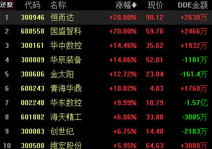 從熱點板塊來看,漲幅榜前10位的板塊近5日漲幅有5個超過10%,顯示A股部分板塊持續(xù)性較好。工業(yè)母機再次登上同花順指數(shù)漲幅榜首,不過,板塊DDE資金卻出現(xiàn)1.04億元的凈流出,有包括國盛智科、恒而達(dá)在內(nèi)的5只個股漲停。