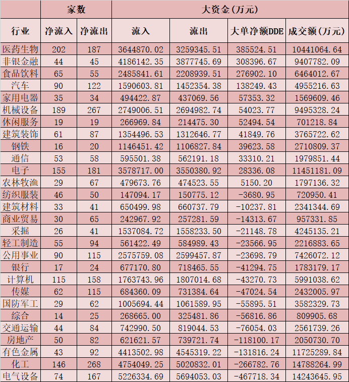 表:9月6日申萬一級行業(yè)大單資金情況