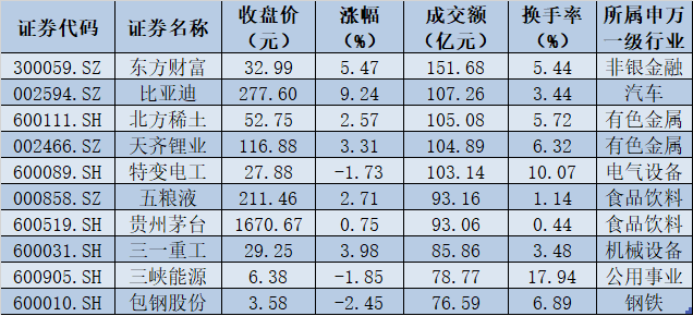 成交量方面,周一,滬深兩市合計成交額14261.48億元,連續(xù)第34個交易日突破1萬億元。部分前期跌幅較大的傳統(tǒng)白馬股出現(xiàn)反彈,熱門賽道及上游資源股分化明顯,東方財富、比亞迪、北方稀土、天齊鋰業(yè)、特變電工等5只個股成交額均超百億元。
