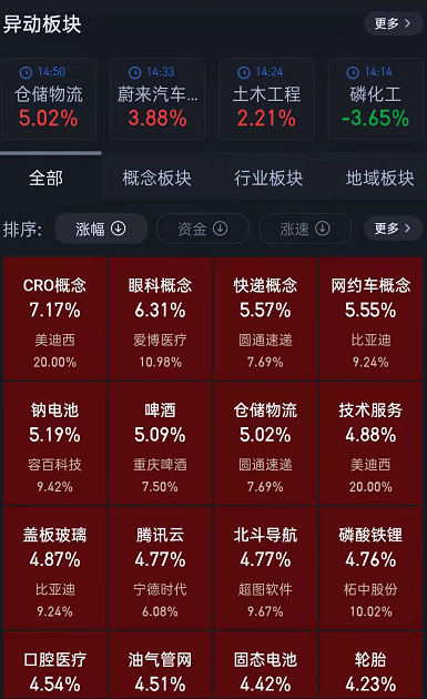 概念板塊方面,CRO概念、眼科概念、快遞概念等異動明顯,漲幅均在5%以上。
