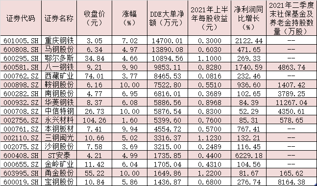 在行業(yè)基本面持續(xù)改善的背景下,社?;鸺梆B(yǎng)老金也提前布局部分鋼鐵股。統(tǒng)計(jì)顯示,截至今年二季度末,有11只鋼鐵股獲社?;鸺梆B(yǎng)老金持倉(cāng),華菱鋼鐵、首鋼股份、鞍鋼股份、甬金股份等4只個(gè)股本期獲社保基金及養(yǎng)老金新進(jìn)持有,持股數(shù)量分別為11267.04萬(wàn)股、2480.05萬(wàn)股、1407.42萬(wàn)股和165.62萬(wàn)股,八一鋼鐵、永興材料、中信特鋼等3只個(gè)股本期也被社?;鸺梆B(yǎng)老金增持,增持?jǐn)?shù)量分別為3153.74萬(wàn)股、360.98萬(wàn)股和61.00萬(wàn)股。