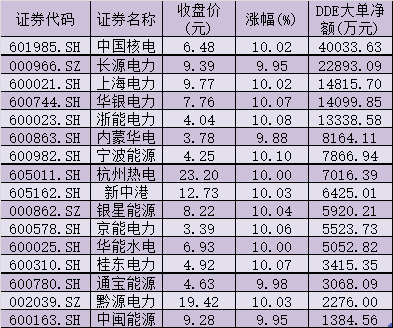 表:16只漲停電力股資金流向情況