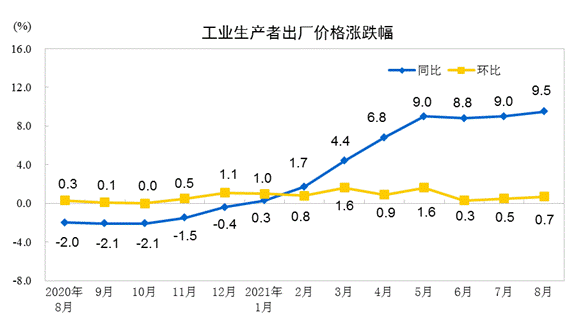8月份,受煤炭、化工和鋼材等產(chǎn)品價(jià)格上漲影響,工業(yè)品價(jià)格環(huán)比和同比漲幅均有所擴(kuò)大。