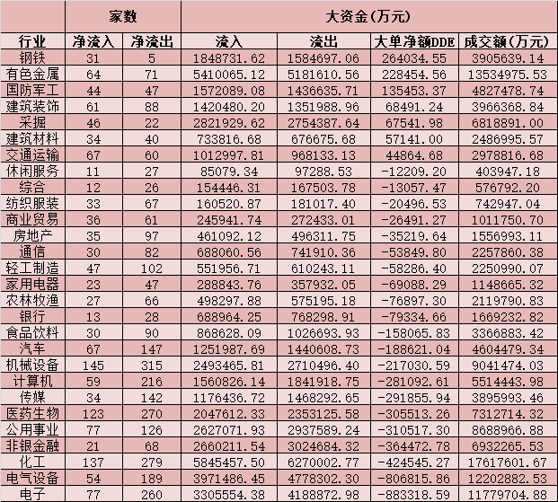 資金流向方面,周四,滬深兩市大單資金凈流出380.97億元,從申萬一級行業(yè)來看,僅7個(gè)行業(yè)呈現(xiàn)資金流入態(tài)勢,鋼鐵和有色金屬等兩行業(yè)大單資金凈流入均在20億元以上。