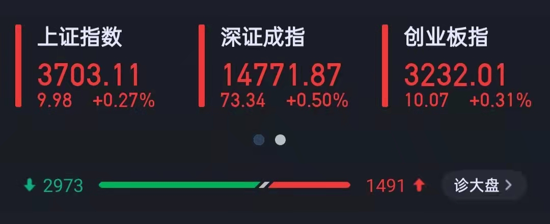 具體來看,截至收盤,上證指數(shù)漲0.27%,報(bào)3703.11點(diǎn);深證成指漲0.5%,報(bào)14771.87點(diǎn);創(chuàng)業(yè)板指漲0.31%,報(bào)3232.01點(diǎn);滬深兩市合計(jì)成交額15439.39億元,連續(xù)第38個(gè)交易日突破1萬億元。
