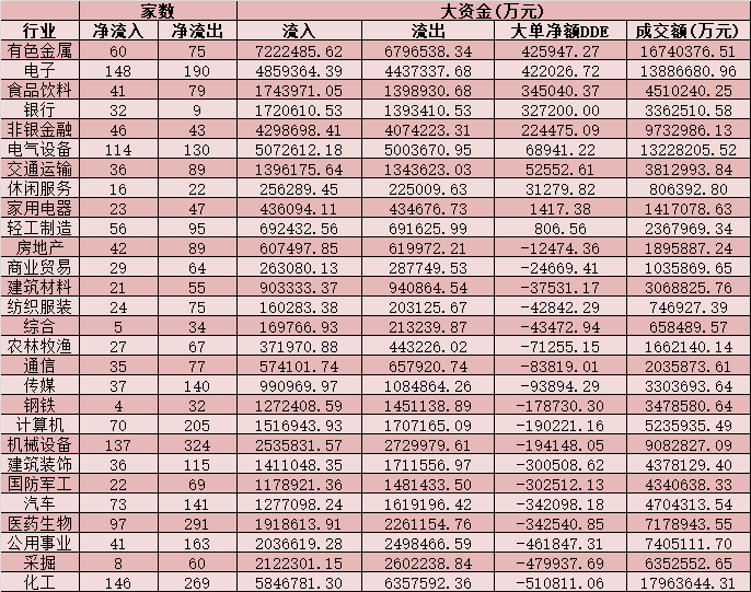 表:周五申萬一級(jí)行業(yè)大單資金凈流入情況