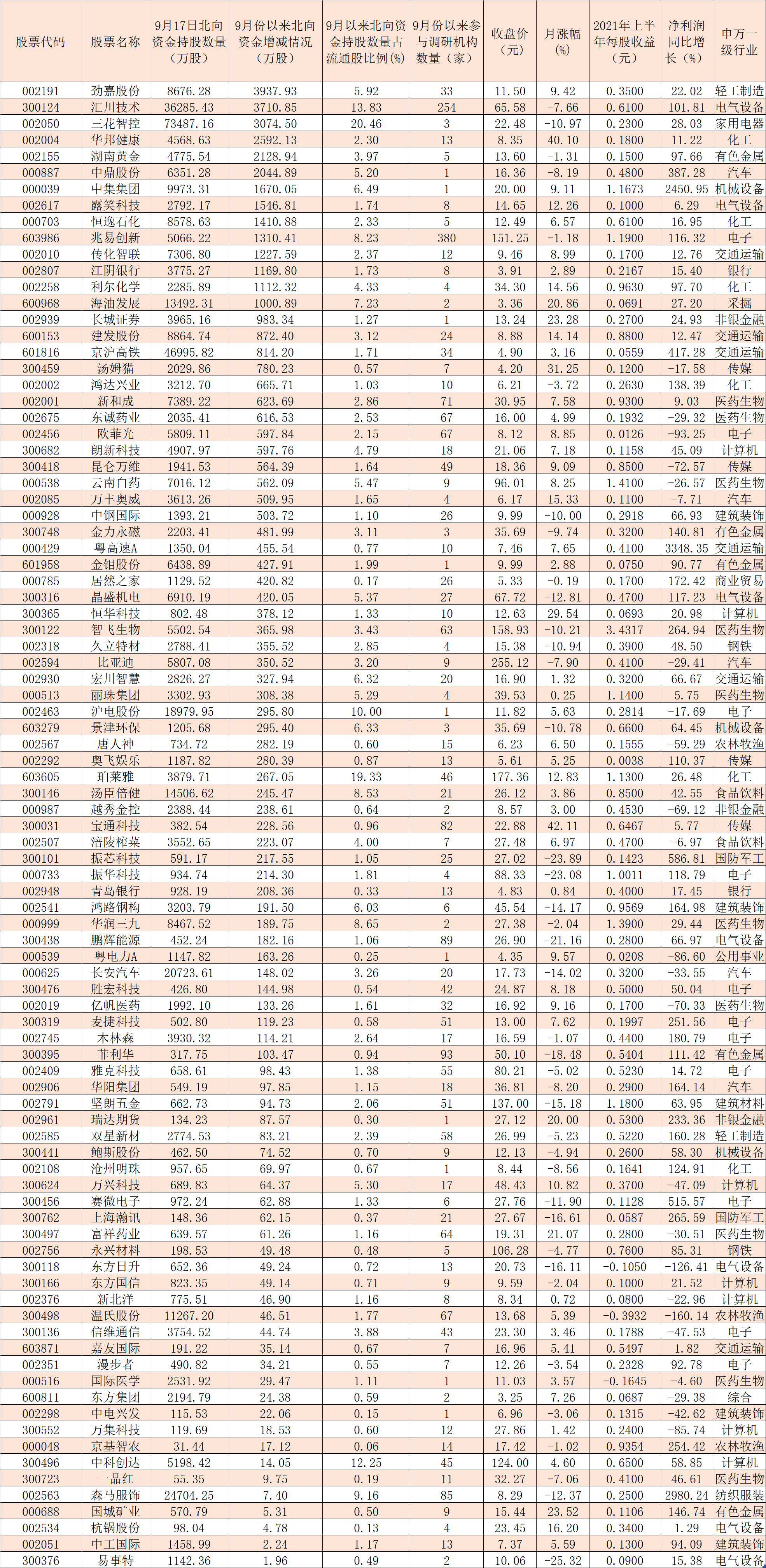 表:9月份以來獲機構(gòu)調(diào)研且被北向資金增持的個股一覽