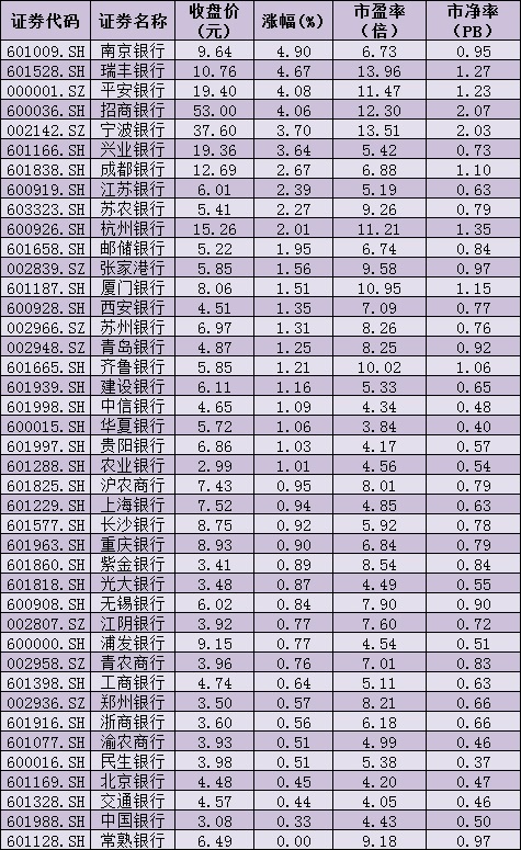 吸金又吸睛!受“公募一哥”張坤節(jié)前兩日買(mǎi)入招商銀行A股超8億元消息的影響,周一,沉寂許久的銀行股逆市崛起,行業(yè)指數(shù)當(dāng)日漲幅達(dá)2.38%,位居申萬(wàn)一級(jí)行業(yè)的漲幅榜首位。41只銀行股悉數(shù)上漲,其中,南京銀行、瑞豐銀行、平安銀行、招商銀行等4只個(gè)股漲幅均超4%。