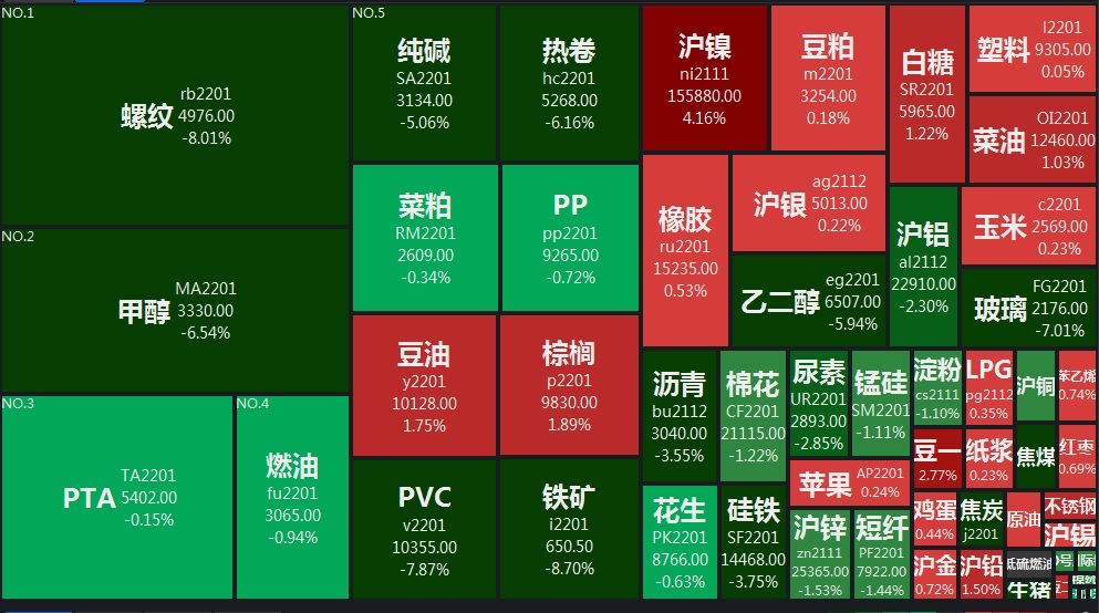 10月21日,國內(nèi)商品期貨收盤,黑色系大跌,焦炭、焦煤、動力煤、螺紋、玻璃跌停,鐵礦跌超9%;值得注意的是,期市交投情緒火熱,螺紋、滬鎳、橡膠、豆油、棕櫚、滬深2111合約成交金額均超1000億,其中螺紋成交額超2000億元。截至收盤,螺紋鋼跌8.01%,報4976元;滬鎳漲4.16%,報155880元;橡膠漲0.53%,報15235元;豆油漲1.75%,報10128元;棕櫚油漲1.89%,報9830元。