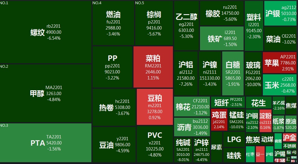 10月22日,國內(nèi)商品期貨多數(shù)收跌,動力煤、錳硅、硅鐵、純堿跌停,焦煤跌超11%,玻璃跌10%,焦炭、尿素跌超8%,螺紋、20號膠跌超6%,橡膠、甲醇、PVC跌超5%,豆油、乙二醇、滬鋅跌超4%。蘋果、雞蛋漲超2%。