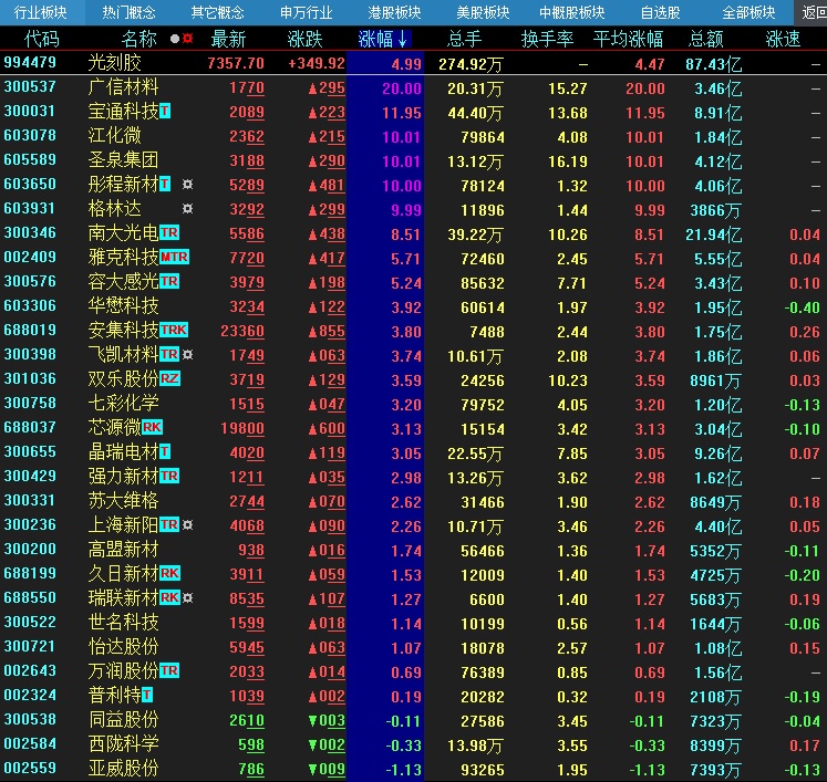 由此可見,在消費股重回升勢中,周期普遍出現(xiàn)遇冷回落態(tài)勢。從具體板塊看,光刻膠板塊漲幅居首,達4.99%,廣信材料“20cm”漲停,江化微、圣泉集團、彤程新材、格林達等也報收于漲停。